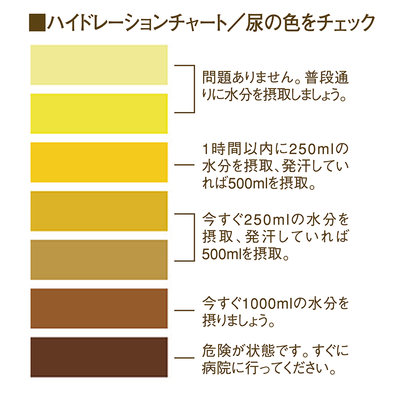また、尿も1つの指標になります。ビタミン剤などを服用していないのに、尿の色が濃いのは水分摂取量が不足している指標になります。