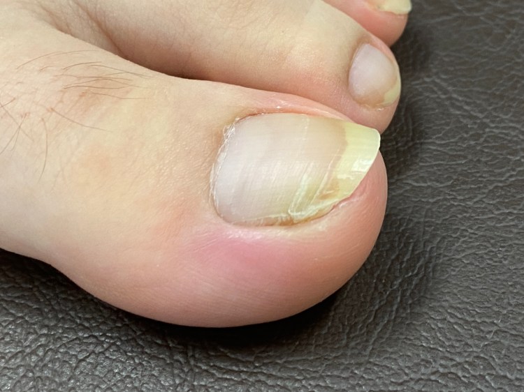 足が扁平足で歩行時に親指の内側に体重が乗って爪が巻いてしまう