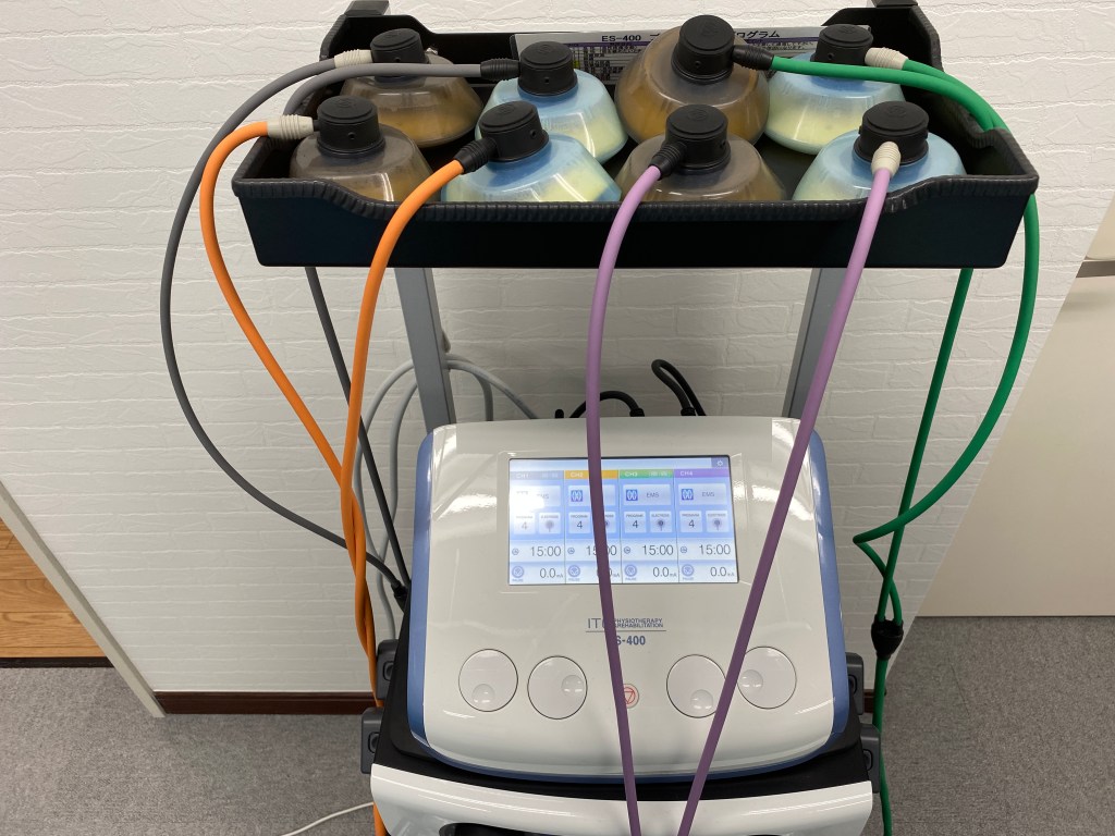 ※左側が超音波治療器、右側が干渉波・マイクロカレント・EMSの複合機です。