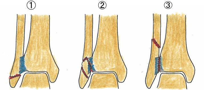捻った際に足首の外側にある腓骨という骨に力が加わり折れてしまうケース。