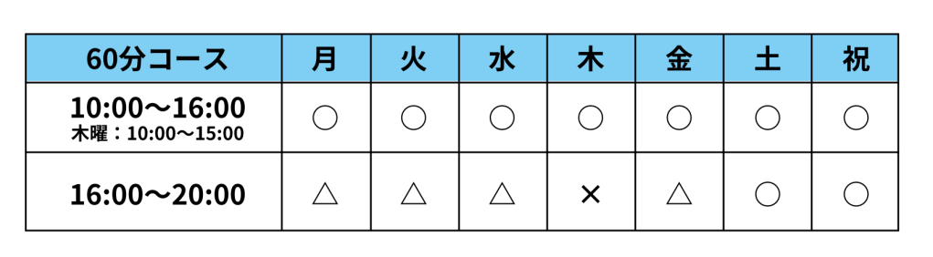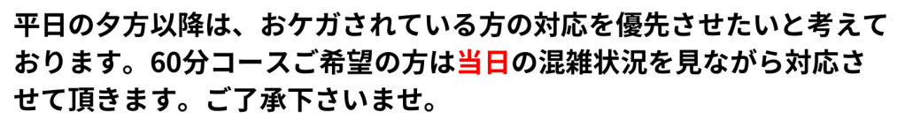 当院のボディメンテナンスはリラクゼーションと異なり、ただ揉み解すだけではなくお体の状態を良い状態に導いていいく事をコンセプトにしております。初回ご利用時は、施術時間+30分のお時間を確保お願いしております。+30分の部分では予診表の記入やお体の状態の把握、チェックを行いますので予めご了承下さい。(追加のご料金は発生致しません)