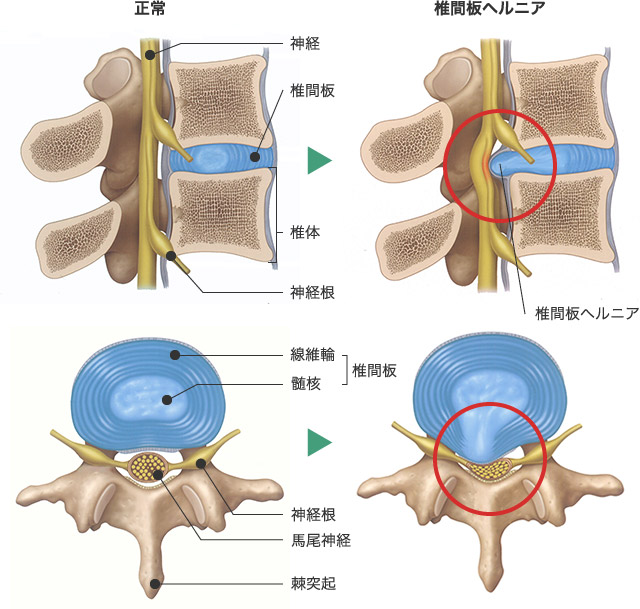 腰部ヘルニアの時に飛び出して入る物は、腰椎の椎間板という線維軟骨です。体のクッション的な役割をしている椎間板が突出して脊髄に触れることによって症状が出るとされています。