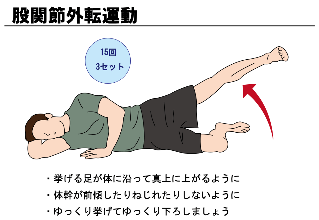 中臀筋という筋肉はバランスをとる筋肉の1つで、シンスプリントになる子は弱い傾向にあります。下の写真が中臀筋のトレーニングになります。